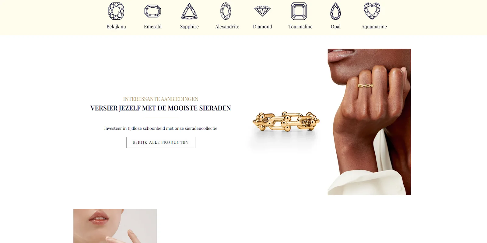 Dit ontwerp straalt luxe, verfijning en exclusiviteit uit, precies wat bezoekers van een high-end sieraden webshop verwachten. Met subtiele kleuren, elegante vormen en een overzichtelijke indeling voelt de website direct stijlvol en toegankelijk. Het design legt de nadruk op kwaliteit en detail, waardoor klanten zich speciaal en geïnspireerd voelen bij elke klik.